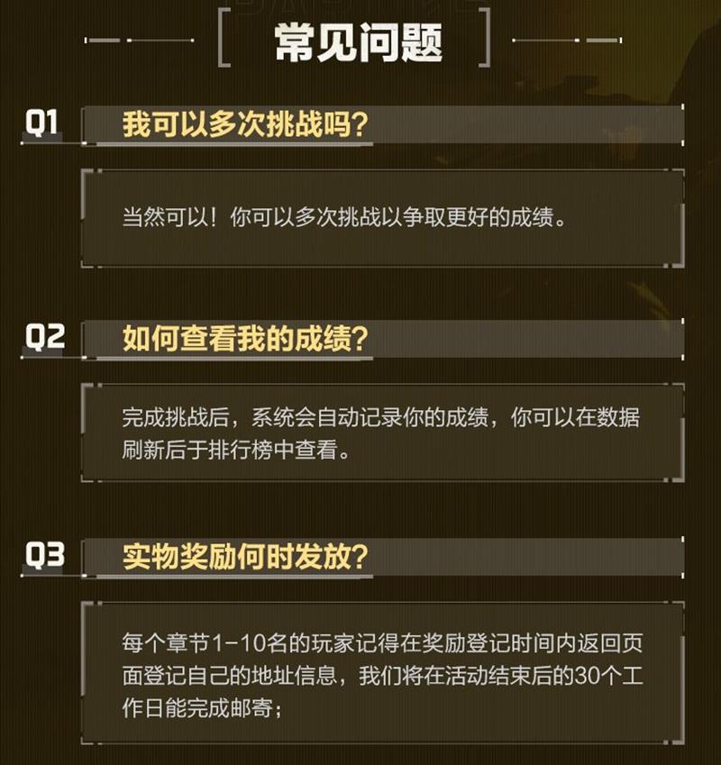 领取奖励:每个章节前10名的玩家记得在奖励登记时间内返回页面登记自己的地址信息,以便领取实体礼盒奖励;游戏道具专属军牌将通过游戏内邮件发送,前20名玩家请留意游戏内邮件。