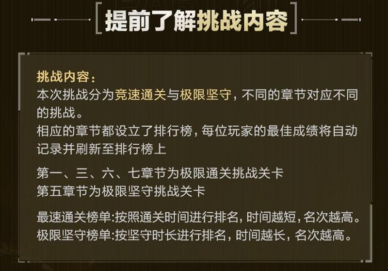 本次挑战分为竞速通关与极限坚守,不同的章节对应不同的挑战。 相应的章节都设立了排行榜,每位玩家的最佳成绩将自动记录并刷新至排行榜上。