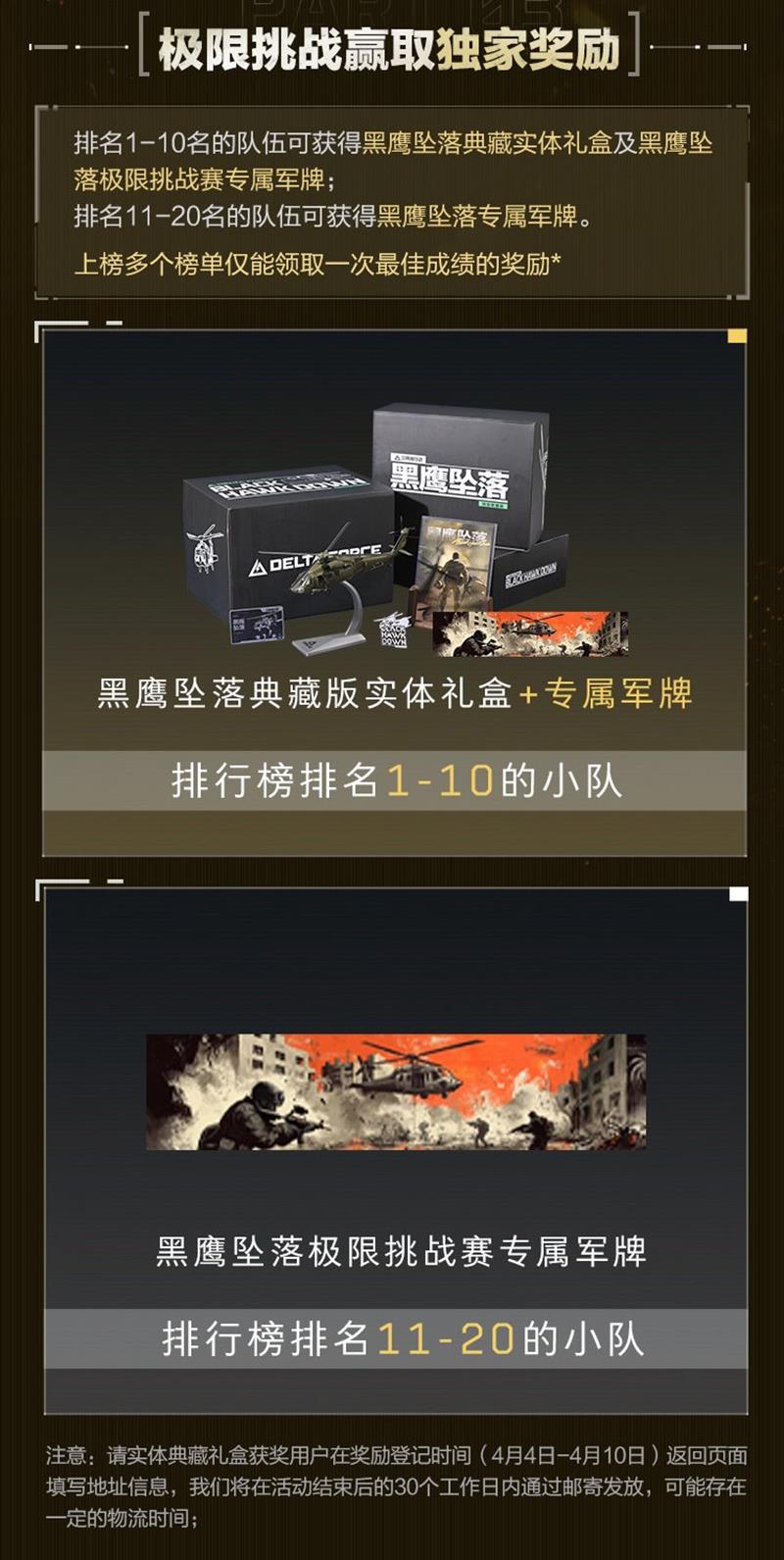 【排名1-10名的队伍】可获得黑鹰坠落典藏实体礼盒及黑鹰坠落极限挑战赛专属军牌。