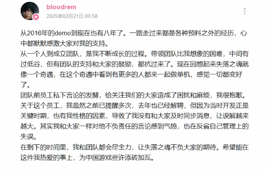 国产动作RPG游戏《失落之魂》(Lost Soul Aside)将于2025年内正式发售,自公布以来一直备受关注。早在先前,失落之魂团队前员工在曾在玩家群中发表不当言论,这些言论被曝光后,制作人杨冰回应称,该员工已于去年被解聘。近日失落之魂制作人杨冰发文回应前员工私下言论的争议,我们来看看。