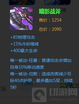 暗影战斧应该是性价比最高的装备,只需要2090块,不单有攻击能破甲加生命,还兼备冷却加速减CD,这一堆属性想想就觉得牛逼。