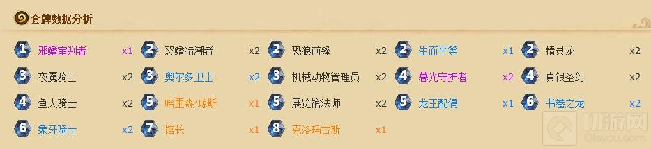 这套鱼龙骑的构筑思路,其实很像原来中速骑的构筑。就是在每个费用上,都填补起高质量的牌。用质量压倒对手。这套牌的清场组件只有单平等+单奉献组成,目的就是最大化的利用费用组织起场面。而且机械动物管理员和动物园魔法师也是能很好提升站场收益的两张随从。是我在新版本骑士的一个构筑思路。