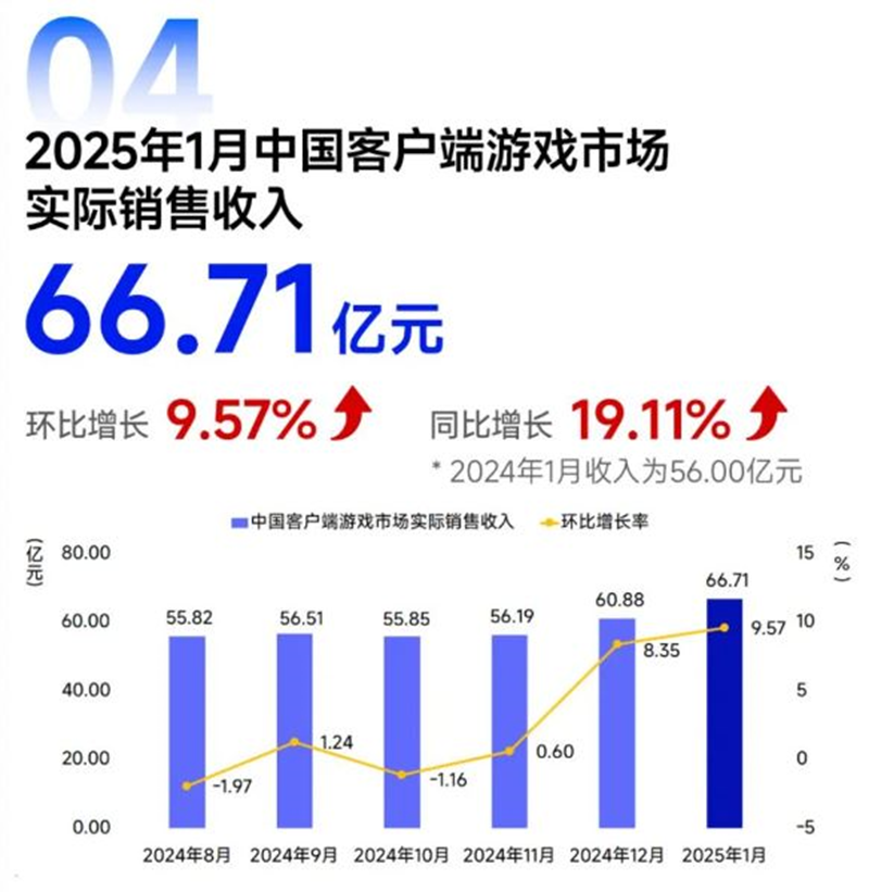 2025年1月中国客户端游戏市场实际销售收入66.71亿元,环比增长 9.57%,同比增长 19.11%。