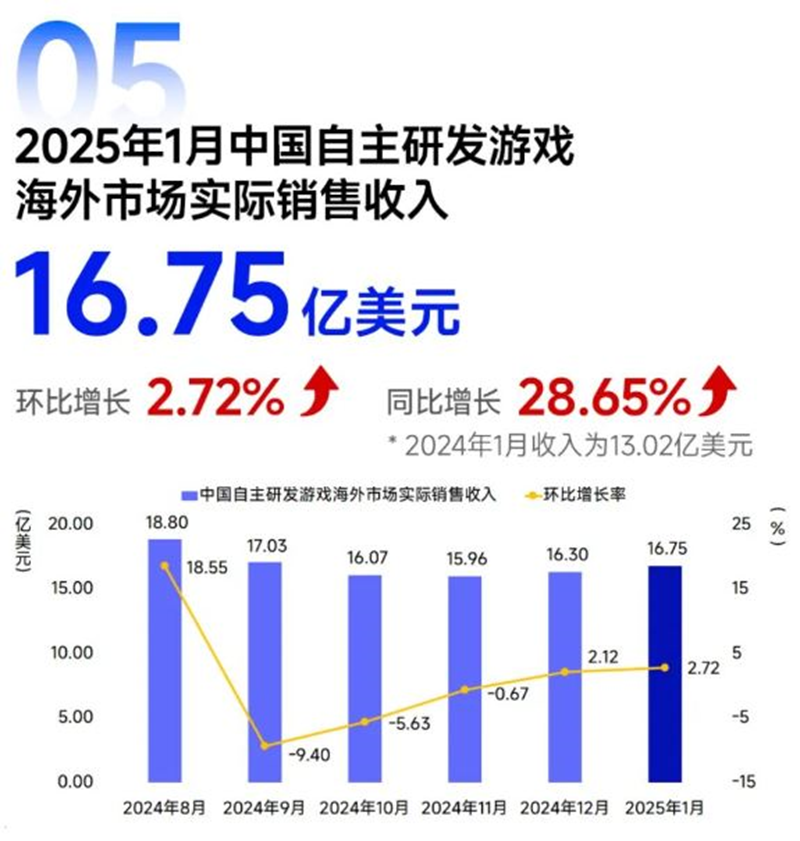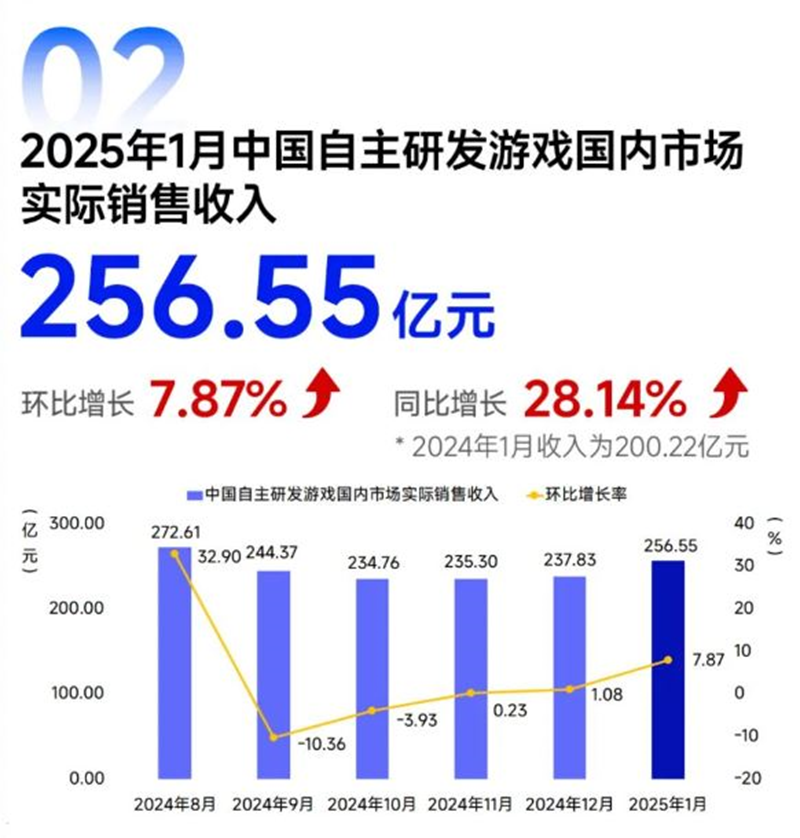 在中国自主研发游戏国内市场数据中,2025年1月中国自主研发游戏国内市场实际销售收入256.55亿元,环比增长 7.87%,同比增长 28.14%。