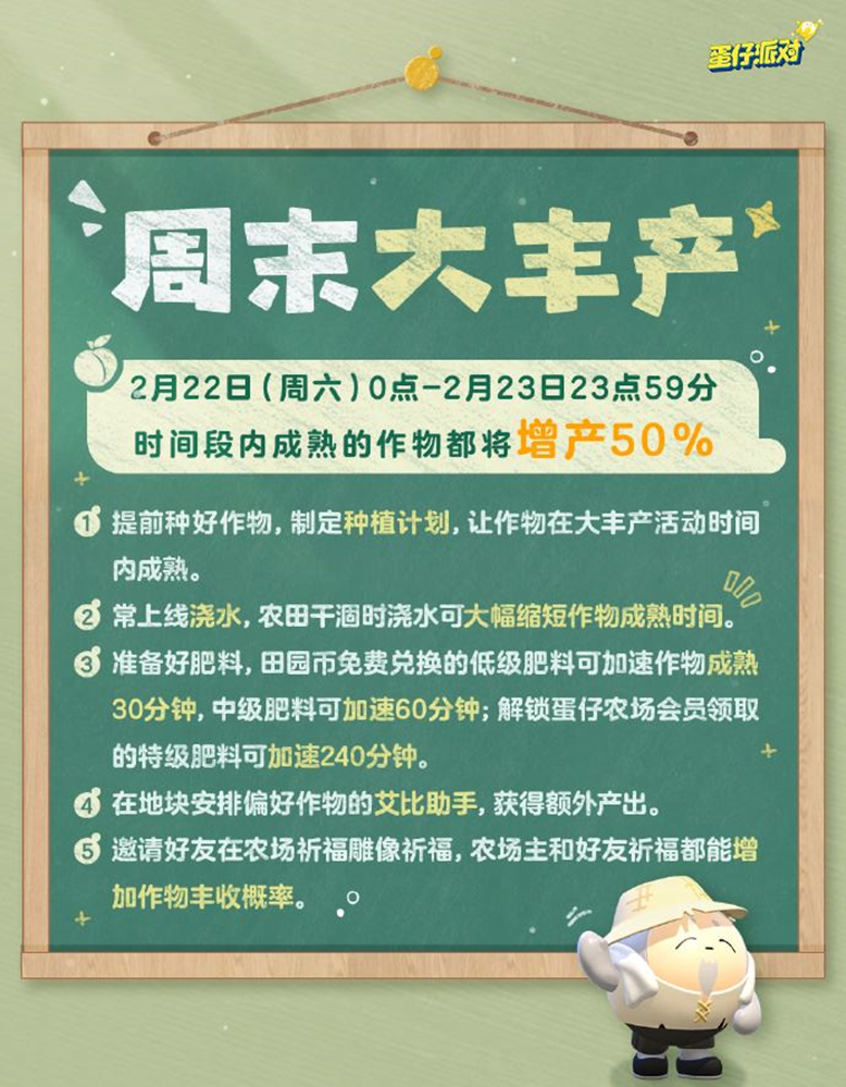 从活动开始,2月22日(周六)0点-23日23点59分,时间段内成熟的作物都将增产50%。如作物是丰收或大丰收状态,50%增产效果也将叠加生效。
