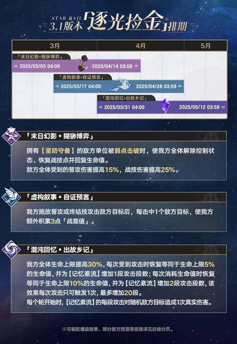 崩坏星穹铁道3.1版本的逐光捡金排期公开了,下面我们一起来看看崩坏星穹铁道的时间安排。