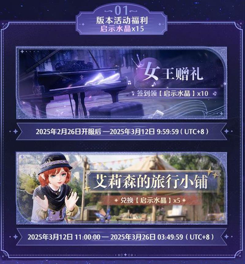 2025年3月12日11:00:00——2025年3月26日03:49:59,在活动商店【艾莉森的旅行小铺】可以兑换启示水晶*5。