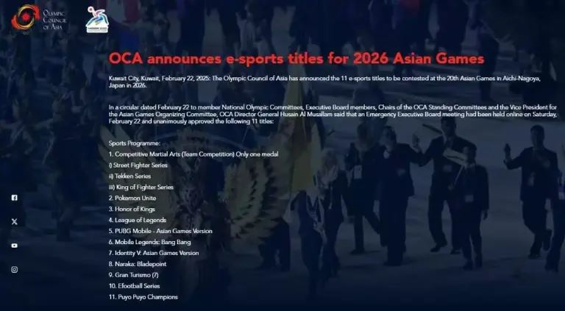 就在2025年2月22日,亚洲奥林匹克理事会(OCA)在其官网发布了新闻稿《OCA公布2026年亚洲运动会电子竞技项目名单》,包含11款正式成为2026年亚洲运动会电子竞技项目游戏。我们来一起看看吧。