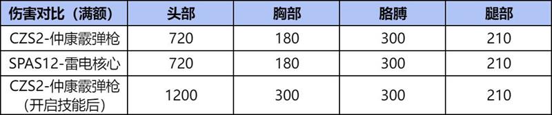 CZS2-仲康霰弹枪形态与SPAS12-雷电核心的满额伤害相同。开启裸衣虎痴技能后,CZS2-仲康霰弹枪形态的头部满额伤害可达1200,胸部满额伤害可达300。测试表明,开启裸衣虎痴技能后,CZS2-仲康霰弹枪形态的秒杀能力大幅提升,但由于移除了防弹衣和头盔,自身被秒杀的风险也显著增加。因此,残血状态下开启技能是较为合理的使用方式。