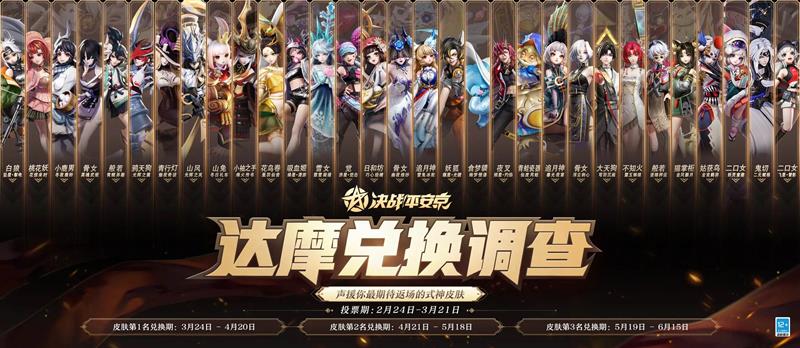 第三轮返场时间为4月25日~5月22日,返场皮肤为第3名追月神-[暮光夜宴]