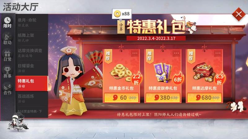 [特惠达摩礼包]、[特惠皮肤券礼包]、[特惠式神与皮肤礼包]限时上架,请勿错过~