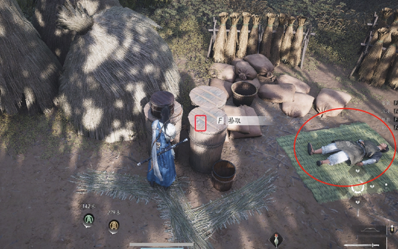 2、根据线索在附近歇息处的木桶上,获得染血金钗;(我们可以看,这有一个睡觉的人,就在他前面木桶上)