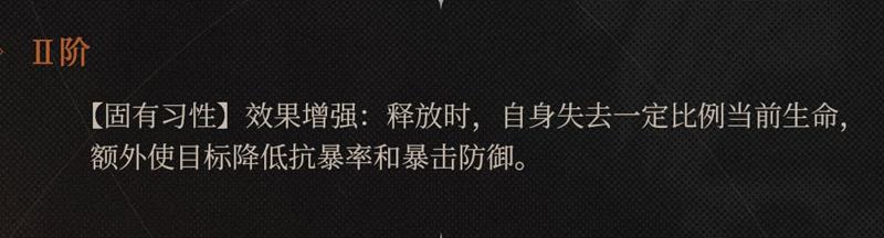II阶 【固有习性】效果增强:释放时,自身失去一定比例当前生命,额外使目标降低抗暴率和暴击防御。