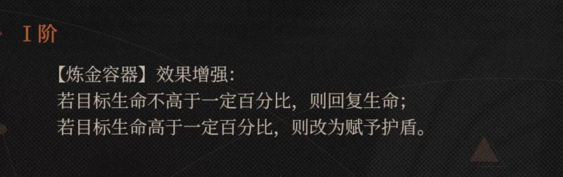 I阶 【炼金容器】效果增强: 若目标生命不高于一定百分比,则回复生命; 若目标生命高于一定百分比,则改为赋予护盾。