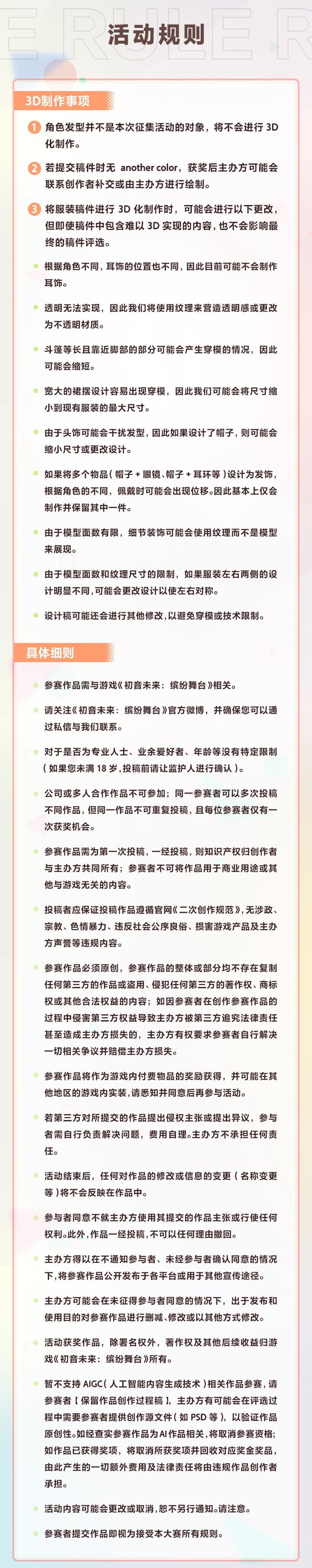 参赛作品将作为游戏内付费物品的奖励获得,并可能在其他地区的游戏内实装,请悉知并同意后再参与活动。