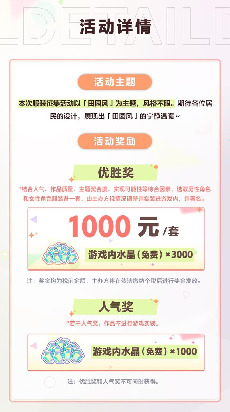 优胜奖:结合人气、作品质量、主题契合度、实现可能性等综合因素,选取男性角色和女性角色服装各一套,由主办方视情况调整并装进游戏内,并命名1000元/套,游戏内水晶(免费) x 3000。