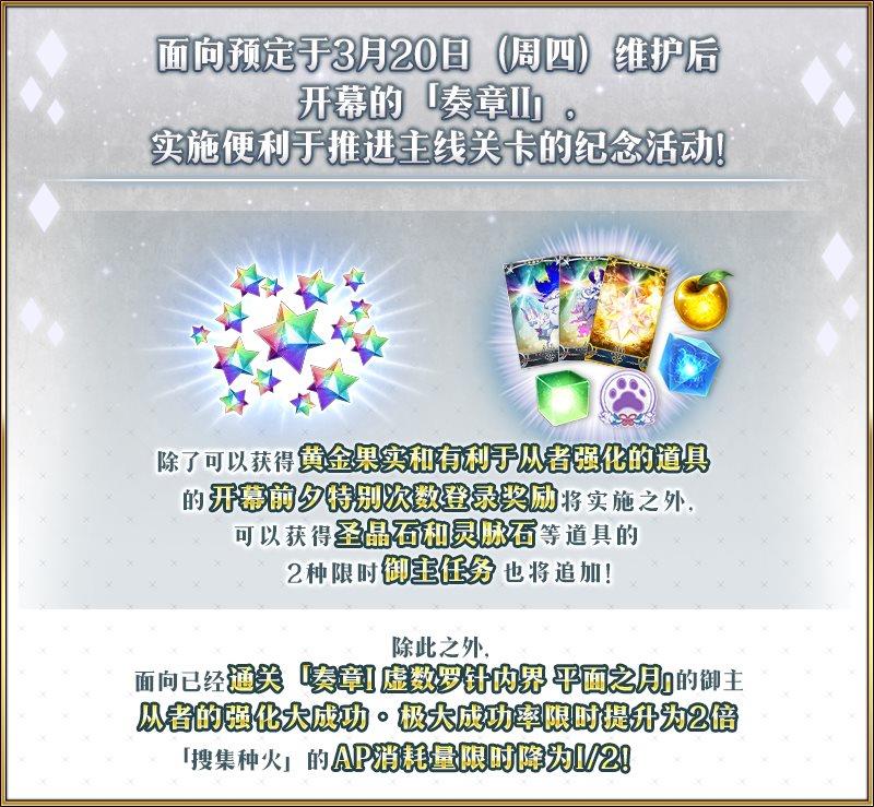 从3月16日周日4点到3月23日周日3点59分,登录游戏5次还能获得3个黄金果实、10张睿智的业火ALL阶5星SSR、5张英灵结晶明星之芙芙ALL阶3星HP、5张英灵结晶太阳之芙芙ALL阶3星ATK、1个兽之足迹和5个圣晶石等特别奖励。