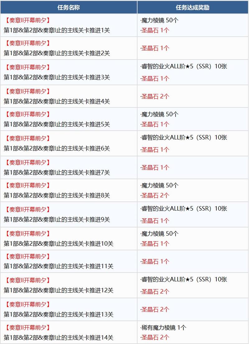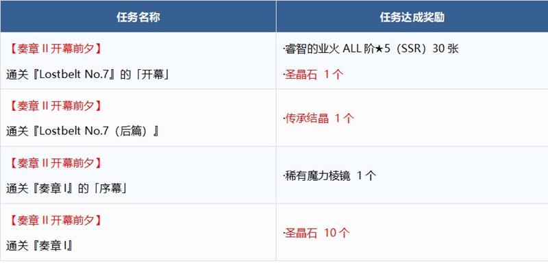 在上述时间段内,御主任务的限定栏中将追加主线关卡进度任务和Lostbelt No.7、奏章I开始及通关任务。完成所有任务后,可累计获得200个魔力棱镜、2个稀有魔力棱镜、70张睿智的业火ALL阶5星SSR、1个传承结晶和30个圣晶石。