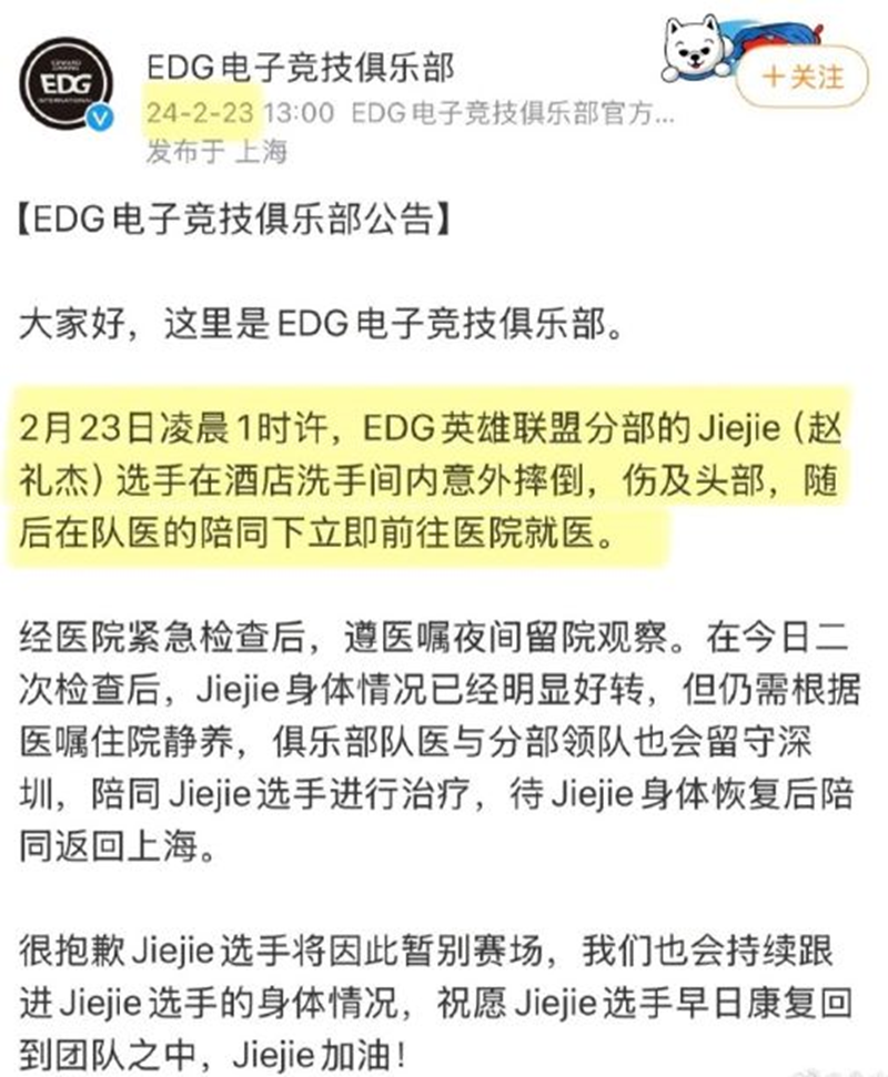 而EDG这边是:2月23日凌晨1时许,EDG英雄联盟分部的Jiejie(赵礼杰)选手在酒店洗手间内意外摔倒,伤及头部,随后在队医的陪同下立即前往医院就医。