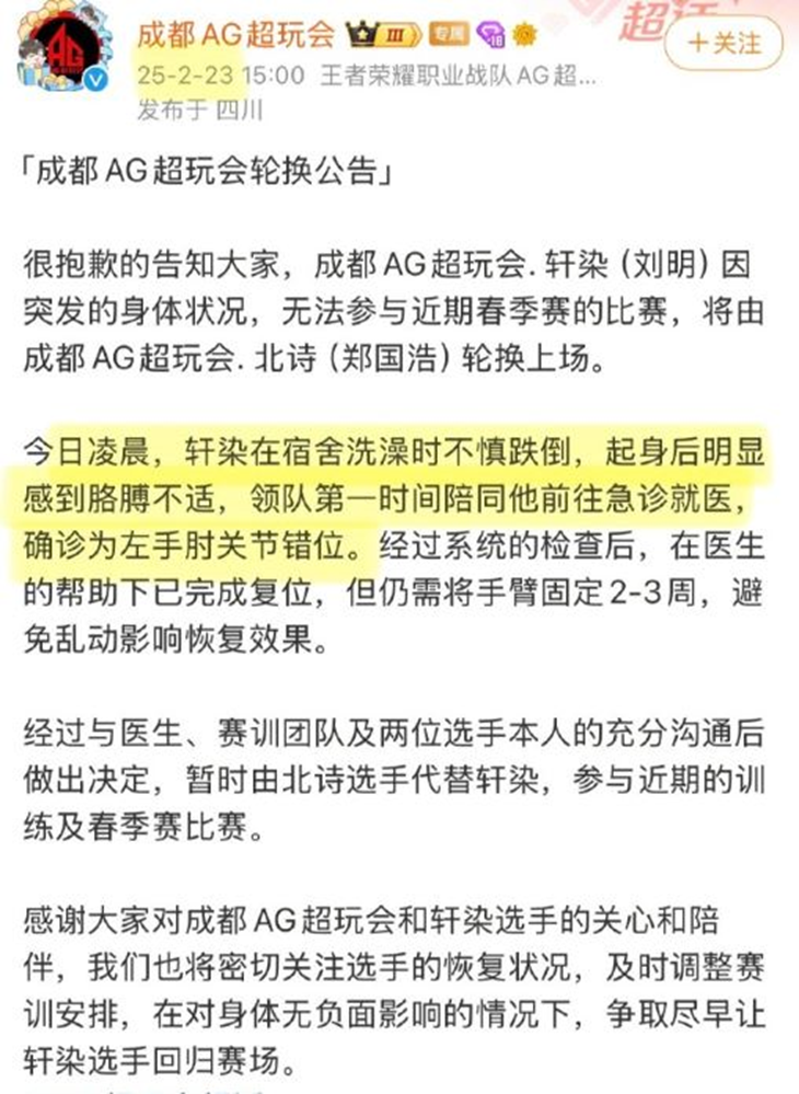 AG超玩会这边是轩染在宿舍洗澡时不慎跌倒,起身后明显感到胳膊不适,领队第一时间陪同他前往急诊就医确诊为左手肘关节错位。经过系统的检查后,在医生的帮助下已完成复位,但仍需将手臂固定2-3周,避免乱动影响恢复效果。