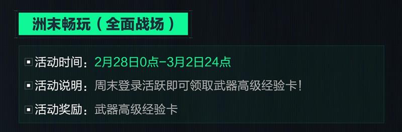 活动说明:周末登录活跃即可领取武器高级经验卡!