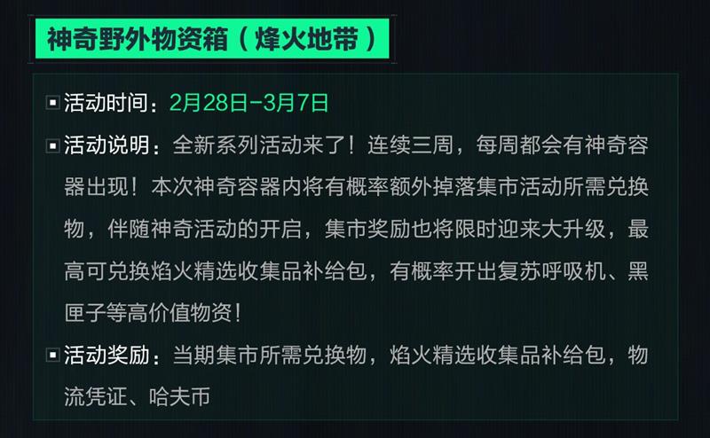 活动说明:全新系列活动来了!连续三周,每周都会有神奇容器出现!本次神奇容器内将有概率额外掉落集市活动所需兑换物,伴随神奇活动的开启,集市奖励也将限时迎来大升级,最高可兑换焰火精选收集品补给包,有概率开出复苏呼吸机、黑匣子等高价值物资!
