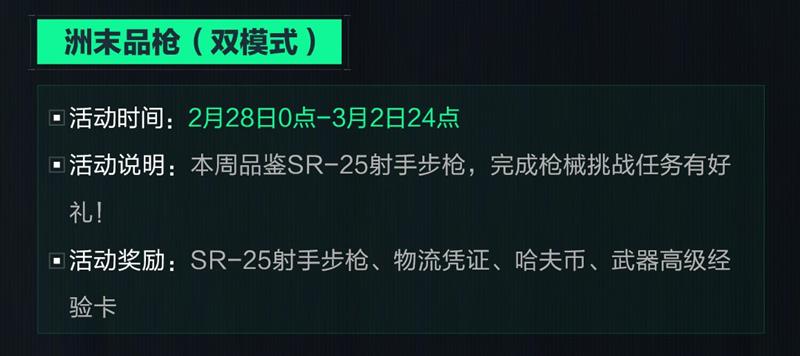 活动说明:本周品鉴SR-25射手步枪,完成枪械挑战任务有好礼!