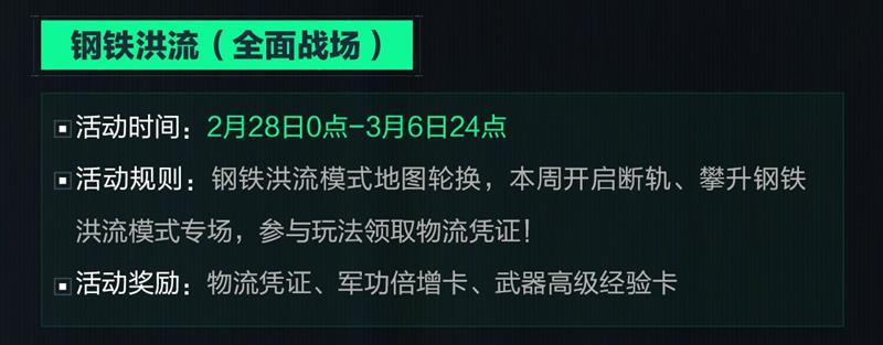 活动规则:钢铁洪流模式地图轮换,本周开启断轨、攀升钢铁洪流模式专场,参与玩法领取物流凭证!