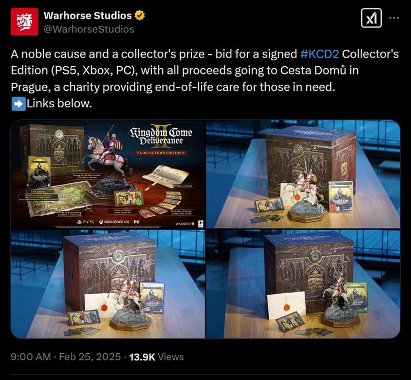 Warhorse Studios 正在为慈善事业拍卖三份亲笔签名的《天国:拯救2》珍藏版,分别适用于 PC、PlayStation 5 和 Xbox Series X/S 平台。此次拍卖的起拍价已经高达 3500 美元,远超普通版游戏价格。