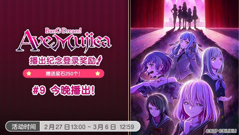 此外,为庆祝《BanG Dream! Ave Mujica/颂乐人偶》动画的播出,游戏内还同步开展了登录奖励活动。自2025年1月9日起,每周随着动画的播出,玩家登录游戏即可领取「星石×250」的奖励。