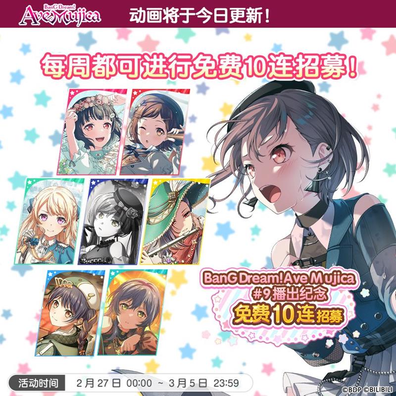 为纪念TV动画《BanG Dream! Ave Mujica/颂乐人偶》的播出,《BanG Dream! 少女乐团派对!》游戏内特别推出了「BanG Dream! Ave Mujica/颂乐人偶 播出纪念10回免费招募 第九期」活动。该活动现已开启,具体安排如下。