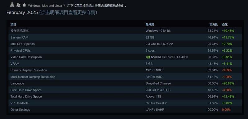 在2025年2月的Steam硬件调查中,各项硬件和系统配置的使用情况也呈现出显著变化。操作系统方面,Windows 10 64位版本以53.34%的使用率继续占据主导地位,较上月增长了10.47个百分点。内存配置中,32GB系统内存的占比达到46.94%,较上月增长13.73%,显示出玩家对更高内存配置的偏好。