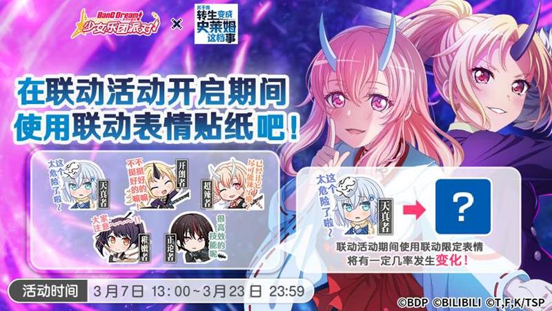 BanGDream官方宣布将于2025年3月7日开展与知名动画作品《关于我转生变成史莱姆这档事》的联动活动复刻,官方宣布将会在活动开启后为所有玩家奉上联动限定表情作为礼物,下面是活动的详情,我们一起来看看。