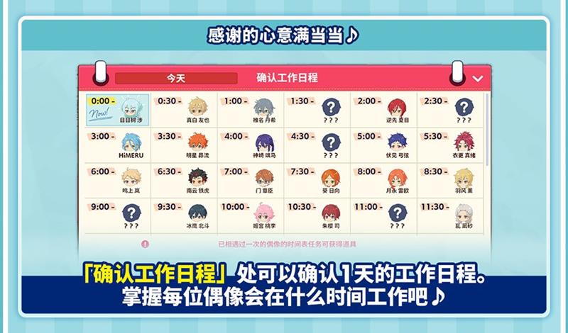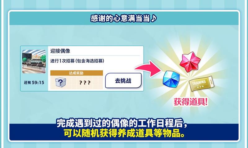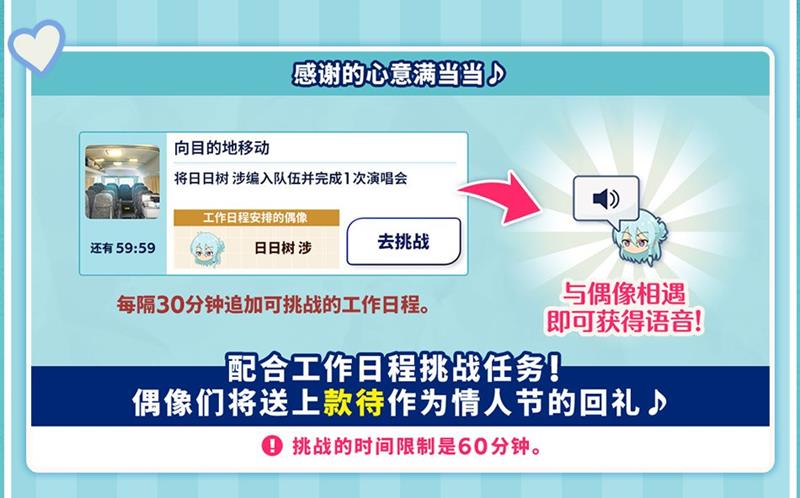 活动开启后,每隔30分钟追加可挑战的工作日程,挑战完成后与偶像相遇可获得活动限定语音。