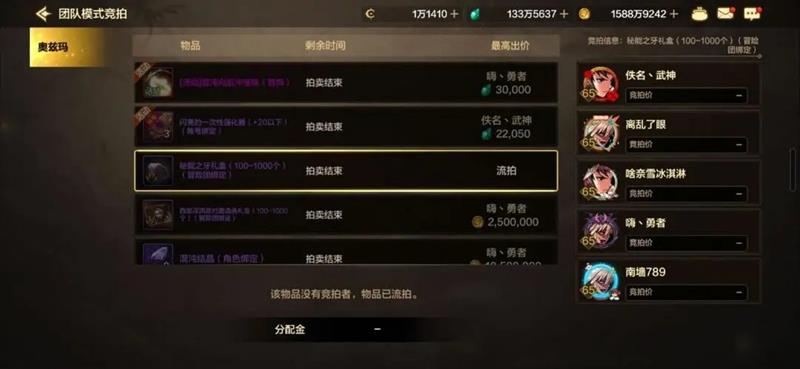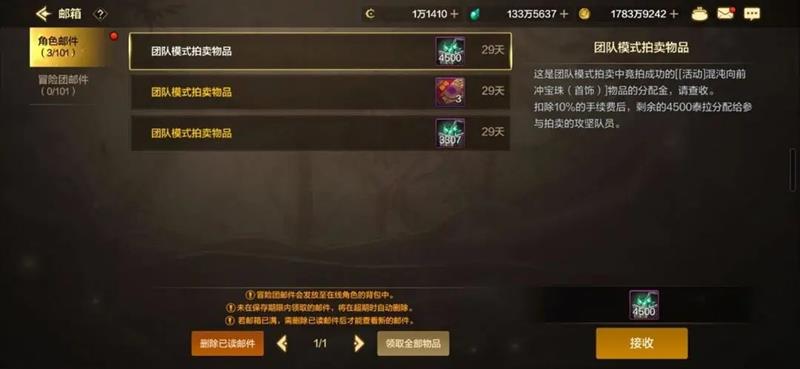 在团队模式中,拍卖物品的分配金规则是竞拍物品成交价扣除10%手续费后,剩余的泰拉或金币会按照6等份分配给参与拍卖的攻坚队员。比如竞拍结束后,泰拉竞拍道具成交价分别是30000泰拉和22050泰拉,此时邮件领取的分配金数额分别为4500泰拉和3307泰拉。需要注意的是,自身竞拍的道具依然会获得分配金,而且即使团队中有已打过团没有竞拍资格的队员,分配金依然按照6等份分配。