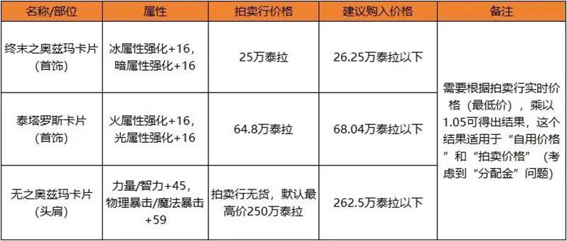 新增活动宝珠类道具由于无法交易且无法转移至冒险团金库,所以在竞拍时要考虑参与角色是否真正需要,以及其价格是否比同属性卡片拍卖行价格更低。购买价格的计算公式为,假设自身竞拍价格为x,拍卖行价格(存货最低价)为y,那么x - x * 0.9 / 6 = y * 0.9。通过计算可得x ≈ 1.05y,也就是说,拍卖行价格乘以1.05,就是我们购入竞拍的价格,此时竞拍价格和拍卖行扣除手续费后所得的泰拉数值基本一致。