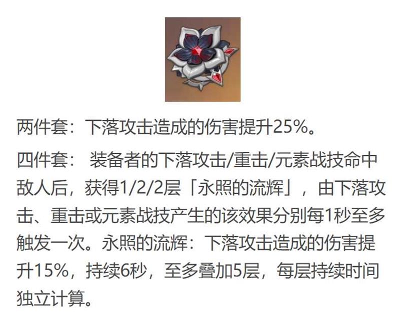 装备者的下落攻击/重击/元素战技命中敌人后,获得1/2/2层「永照的流辉」,由下落攻击、重击或元素战技产生的该效果分别每1秒至多触发一次。永照的流辉:下落攻击造成的伤害提升15%,持续6秒,至多叠加5层,每层持续时间独立计算。