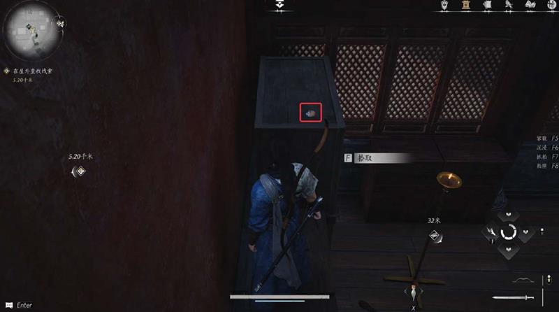 3、根据线索,使用听风辨位寻找脚印,根据脚印来到一弟子房间,发现一物件置于柜子上方,拾取得到装有龙头香的香囊;