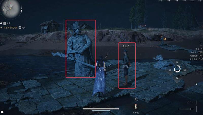 1、夜晚来至鱼柏川,在一座石像前找到老张头,与老张头对话,对话结束后向老张头旁的石像祭拜,祭拜结束后再次与老张头对话,获得线索;