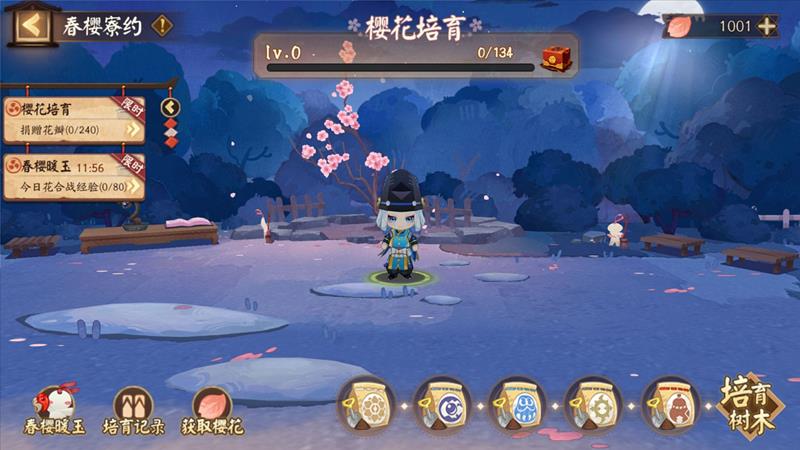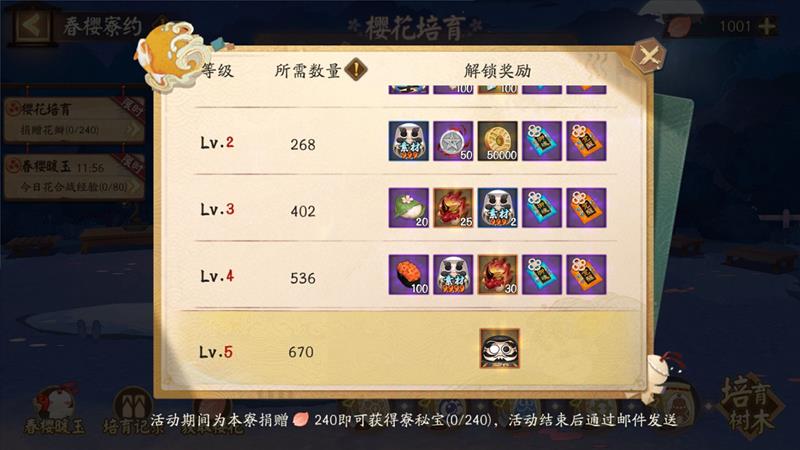 活动期间,玩家在完成日常玩法后将获得“春樱花瓣”。前往寮境内樱花树附近区域,玩家可选择「天域牌」、「七恶神牌」、「平安京牌」、「高天原牌」或「大江山牌」任意一种养料,捐赠“春樱花瓣”即可获得培育奖励,并与寮友共同提升樱花树等级,解锁包括御行达摩、四星奉为达摩等寮秘宝奖励。需注意,每位玩家至少向同一阴阳寮捐赠240个“春樱花瓣”才能获得对应等级奖励,同时捐赠时还有机会获得“阴阳寮勋章”,活动期间最多可额外获得500个。