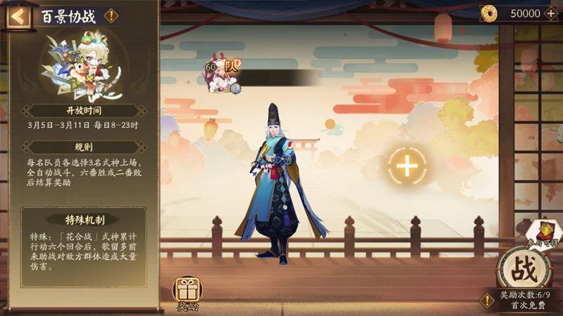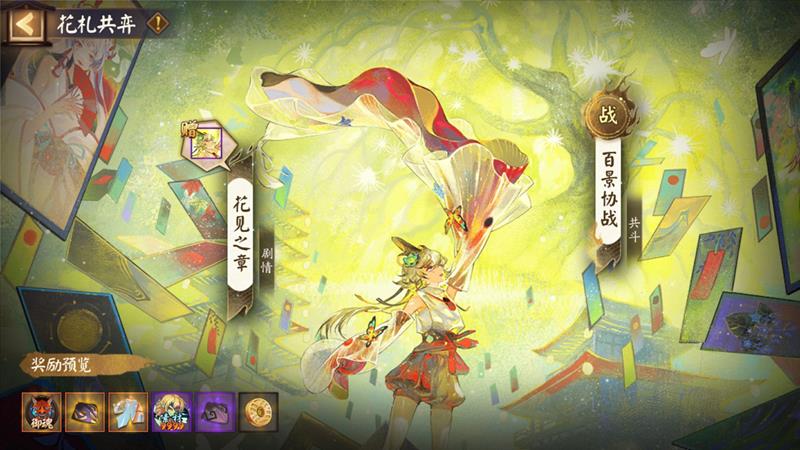 百景协战:活动期间每日8:00-23:00,大人们可参与「百景协战」进行特别版协同对弈,在选择式神过程中会出现特殊的「花合战」式神,这些式神可在战斗中触发「歌留多的祝福」。拥有奖励次数时根据胜场次数可获得「随机六星御魂」、「大蛇的逆鳞」、「被遗忘的绘本」等奖励。