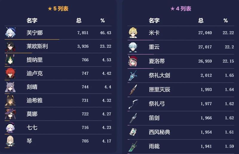 在角色抽取方面,仅有统计到的水神芙宁娜共出货7851只,莱欧斯利出货3926只,两者抽取比例约为1.99:1。莱欧斯利的抽取数量比预想的高不少,出乎不少人的预料,其厨力玩家群体的发力功不可没。