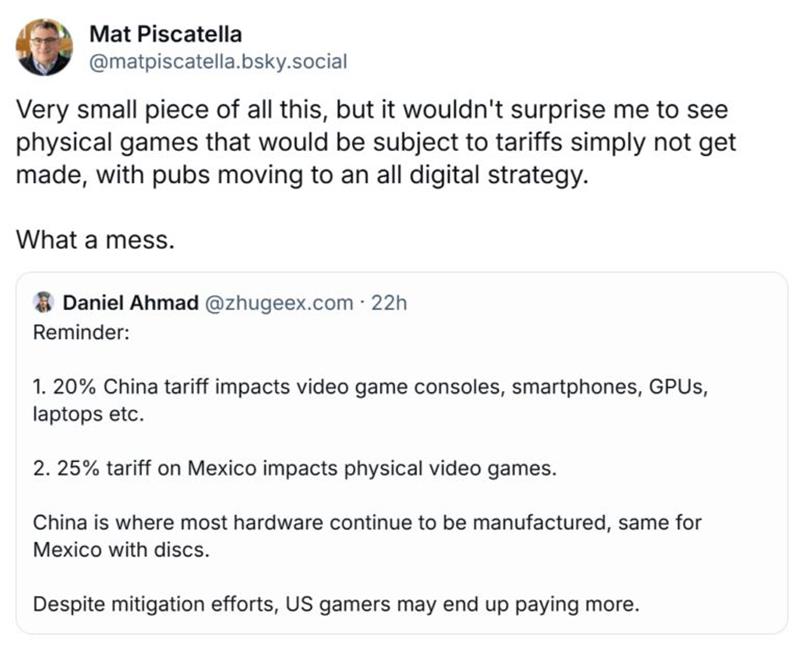 Circana分析师马特·皮斯卡特拉在Bluesky上表示,从墨西哥进口实体商品的成本增加可能会促使发行商远离实体游戏。