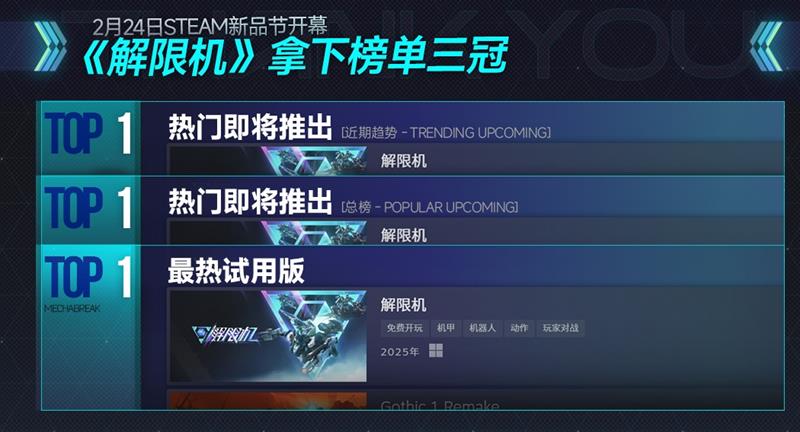 在此次“全球风暴”测试中,《解限机》的Steam在线玩家峰值一度达到31.7万人,超越了《漫威争锋》《GTA5》等热门游戏,位居全球热玩榜第四位。此外,还有超过200万玩家将其添加至Steam愿望单,使其成为2025年全球玩家最期待的游戏之一。