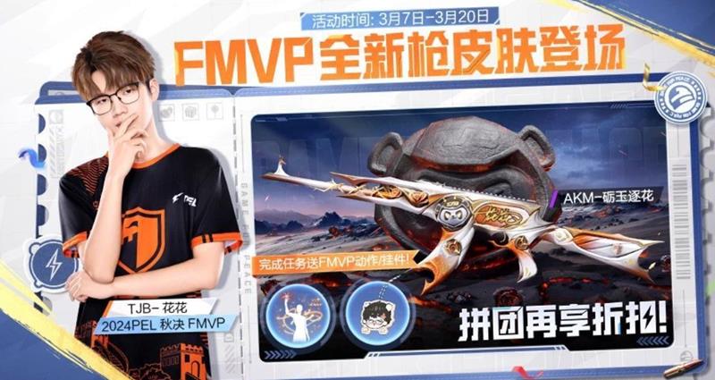 外观与特效:AKM砺玉逐花皮肤整体设计较为华丽,枪身带有金色的FMVP标志,检视时子弹安放处会有金色图标和职业选手花花的签名,上方还有两个金色闪光灯照在角色身上。