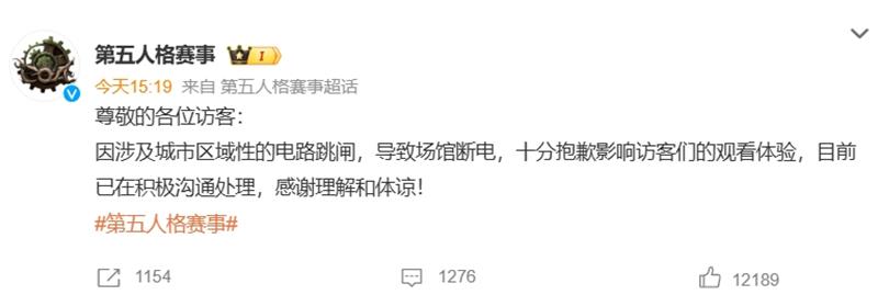 据悉,此次第五人格赛事比赛地点是在广州网易总部举办,官方表示断电原因为城市区域性跳闸,从现场放的图来看,赛场确实因断电受到影响。