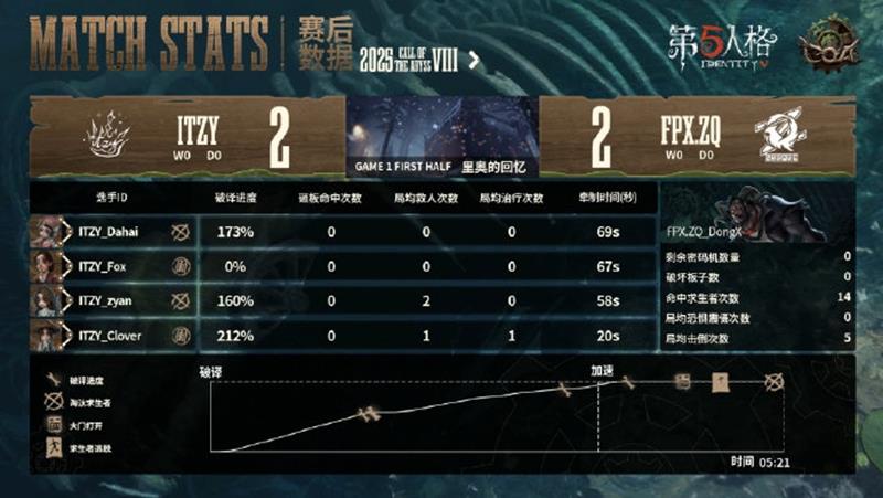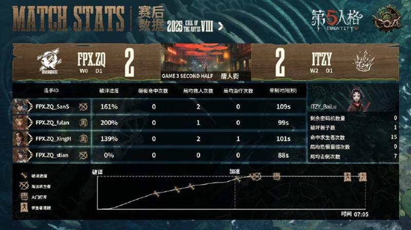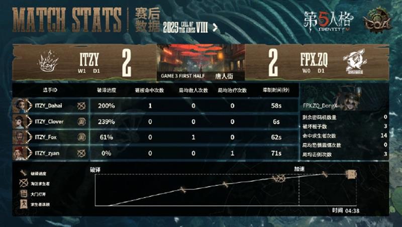 上半局FPX.ZQ_DongX“跛脚羊”开局追击大副,守椅战求生者多次稳定救援,中期双方围绕密码机展开拉扯,四人开门战“心理学家”及舞女被留下,最终双方战平。