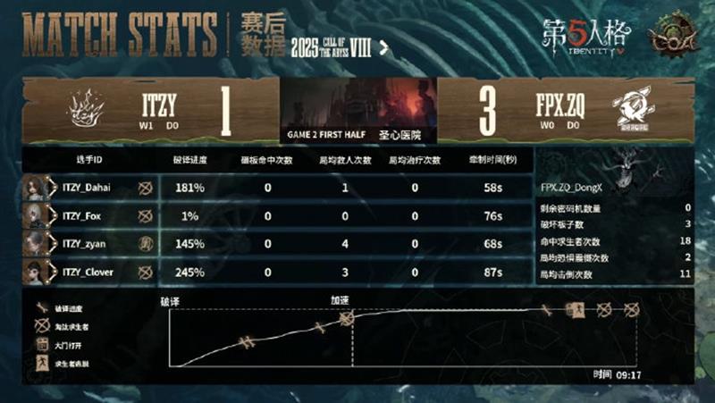 上半局FPX.ZQ_DongX时空之影开局追击守墓人,守椅战求生者稳定救援,中期时空之影利用伊斯人围绕密码机展开控场,后期入殓师利用灵柩返生为队友争取破译时间,三人开门战古董商及“心理学家”被留下,最终FPX.ZQ监管者完成三抓。