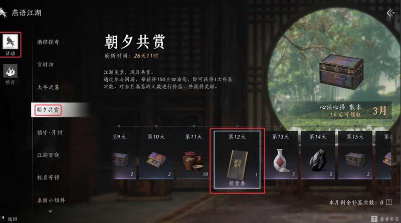 2、于12号和31号当日在朝夕共赏活动签到可分别领取1张。