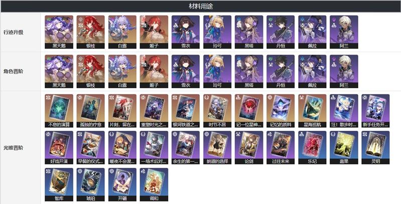 黑天鹅、银枝、白露、姬子、雪衣、玲可、黑塔、丹恒、佩拉、阿兰等角色行迹升级、晋阶都需要消耗蠢动原核。